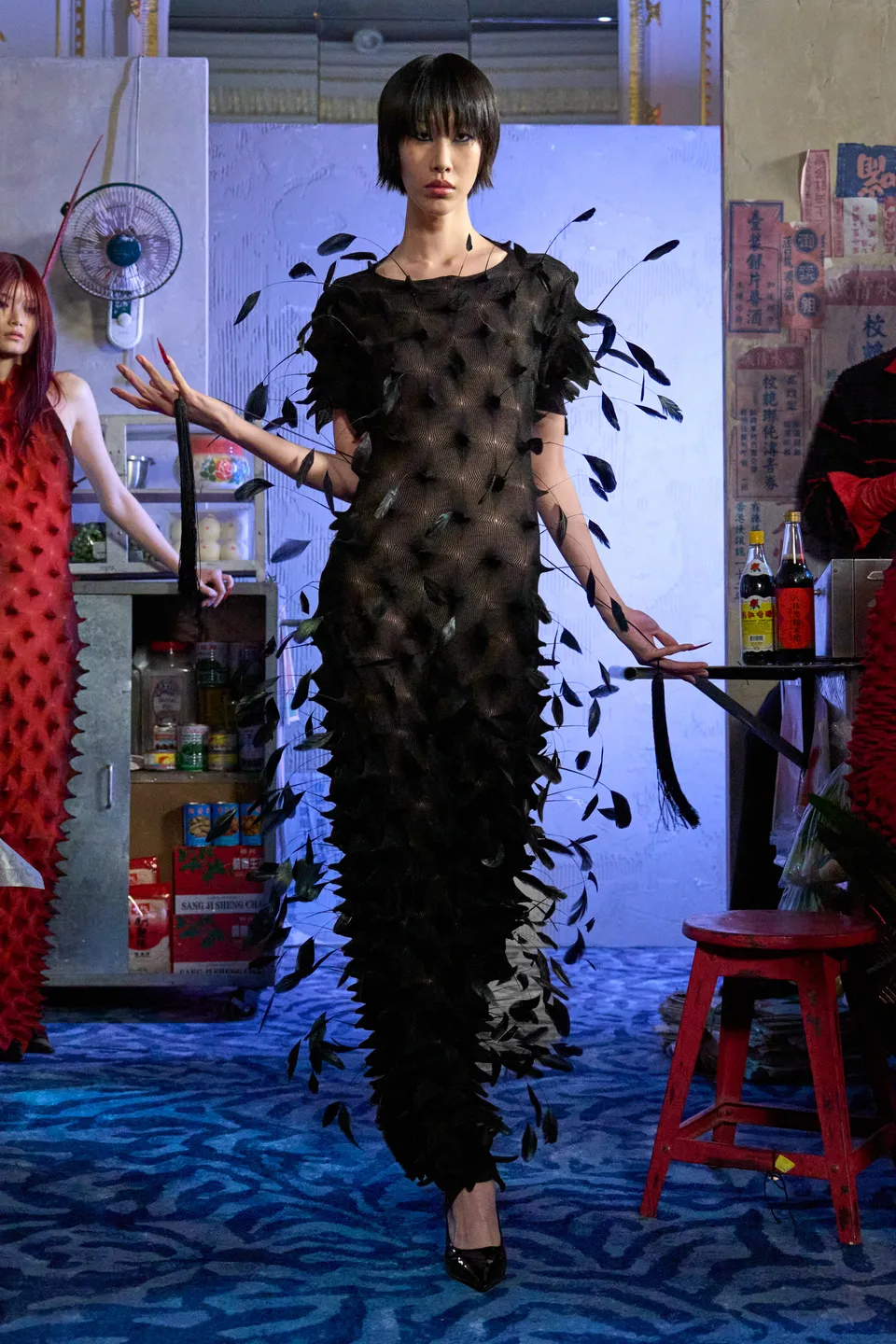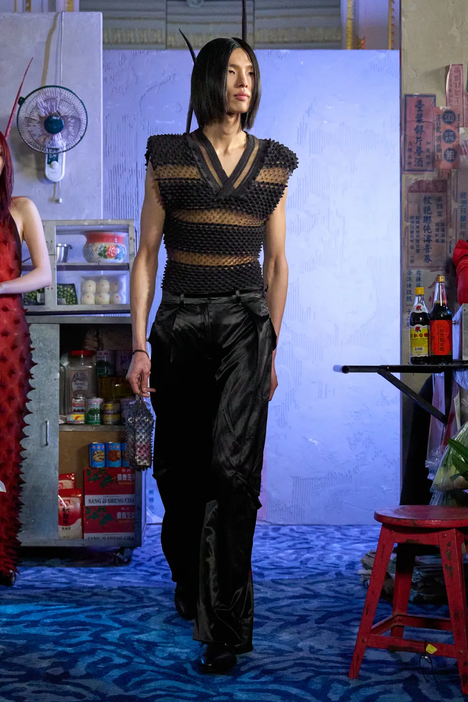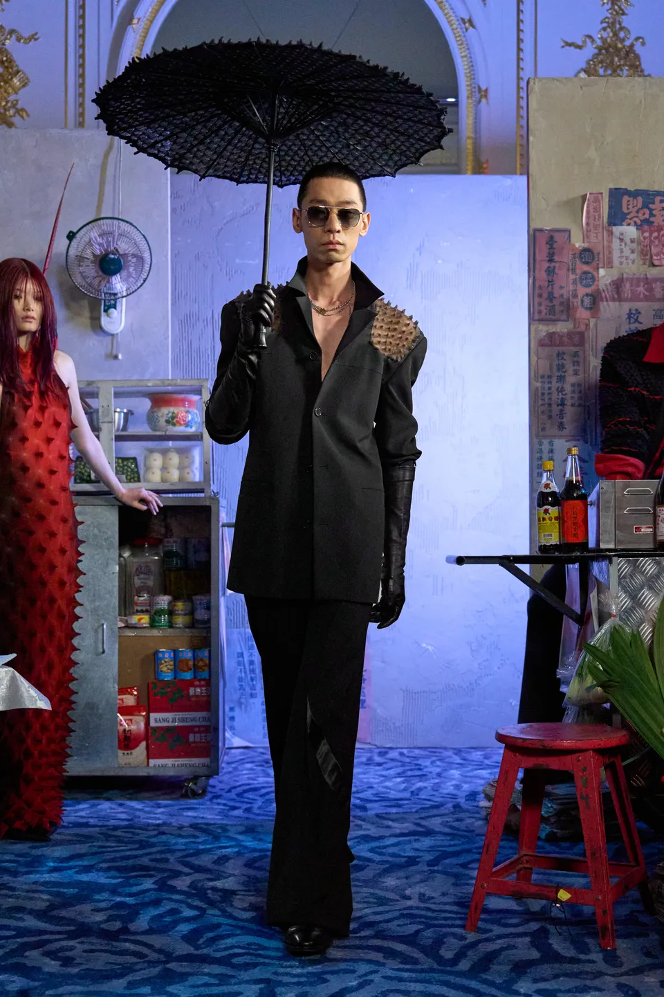 Merino wool spikes that oscillate armour and caress, second-skin knits rooted in romance but with restraint. These delicate yet defensive textures act as boundaries rather than barriers; softness learning how to stand its ground. With these codes firmly established, Night Market opens outward. Though the Western gaze traditionally stigmatises Asians as submissive or unseen, this collection insists on presence: deliberate and unapologetically public. The season unfolds much like the market itself. A palette of black, green, crimson, and charcoal mirrors neon cutting through night air, steam rising from food stalls, and shadows cast between bodies moving shoulder to shoulder. Feathered eyewear pieces are drawn from Lo’s fascination with Peking opera and Chinese theatrical tradition, where adornment signifies status and vitality. The eye is framed yet partially concealed, mediating desire and self-protection. Historically, performers use specialised head movements in dramatic climaxes to animate the feathers. Umbrellas play into both literal and emotional architecture: inspired by an intimate pause when Lo and his partner found themselves sheltering beneath an umbrella at a local market, waiting for the storm to pass.