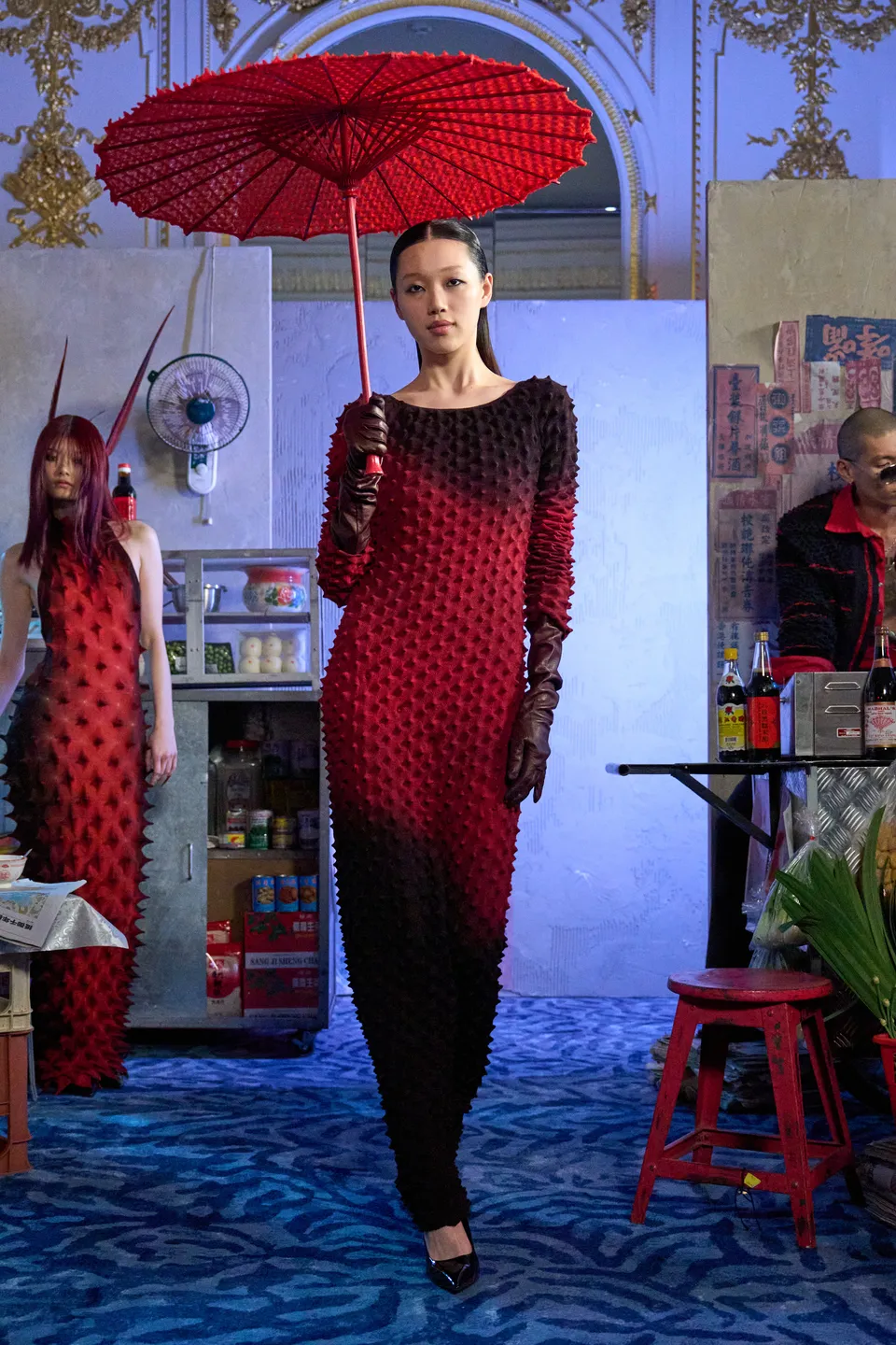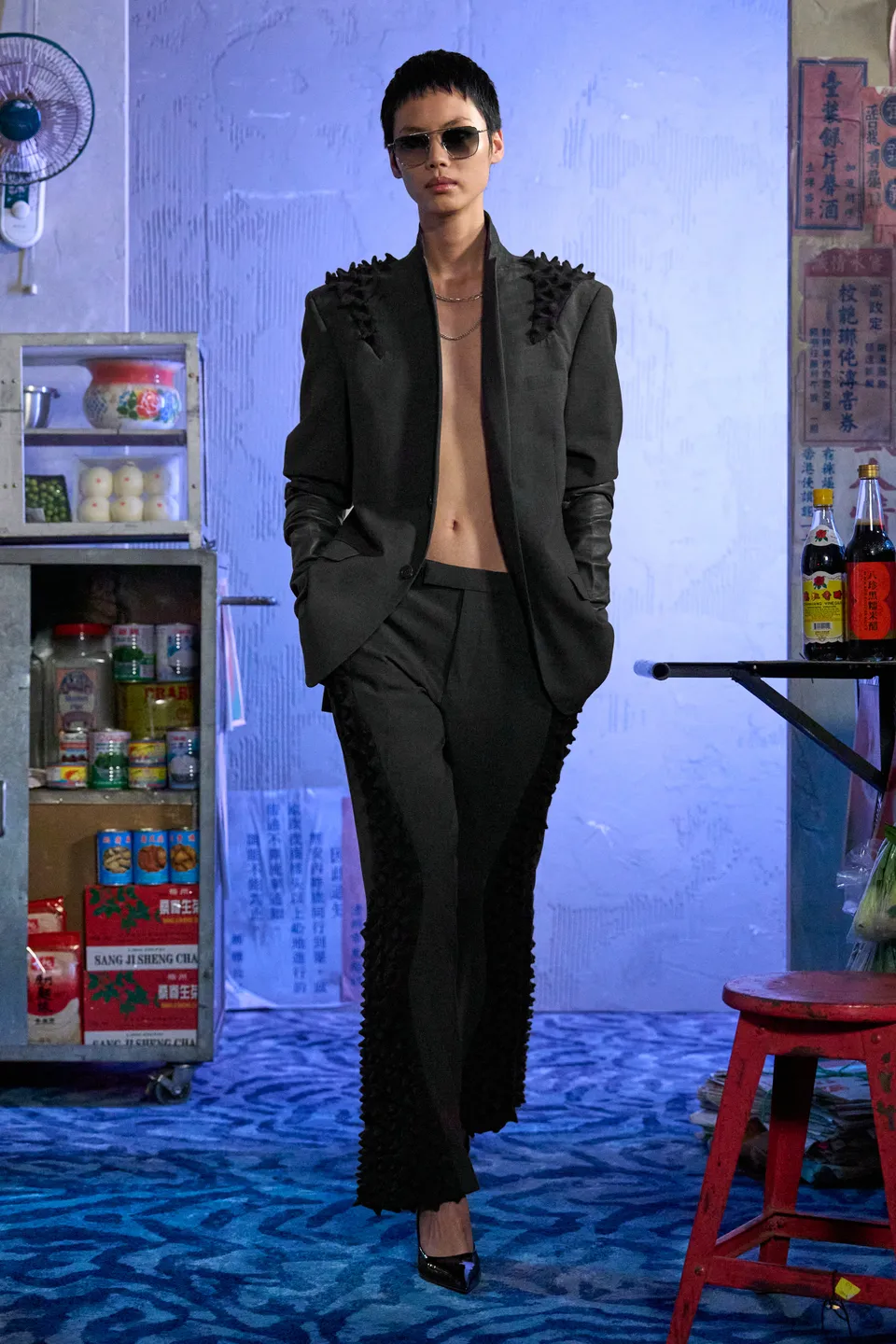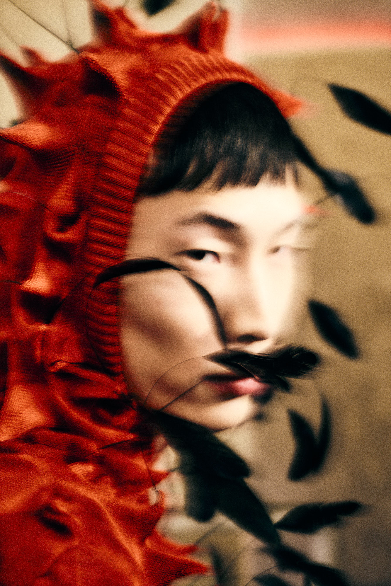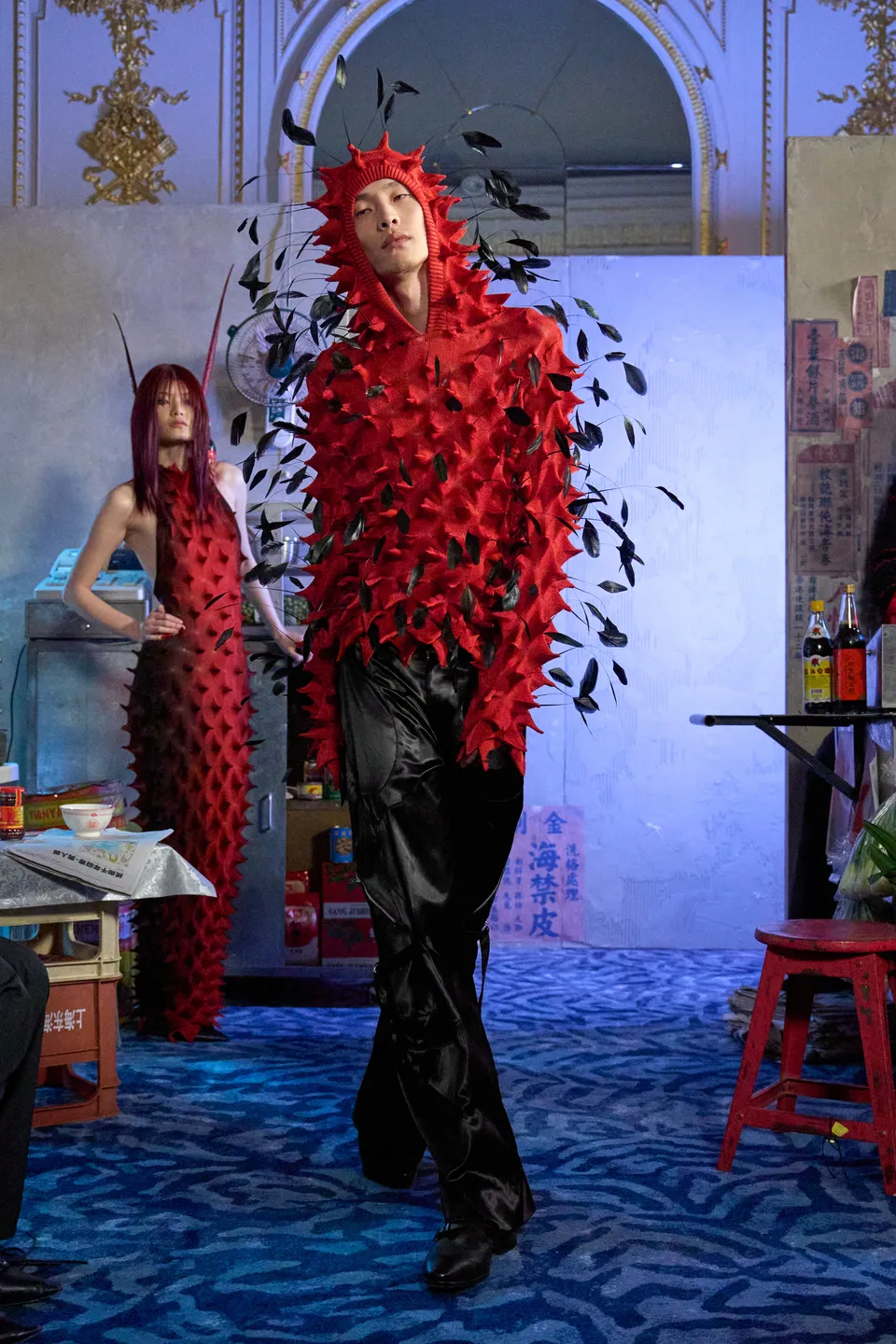 Merino wool spikes that oscillate armour and caress, second-skin knits rooted in romance but with restraint. These delicate yet defensive textures act as boundaries rather than barriers; softness learning how to stand its ground. With these codes firmly established, Night Market opens outward. Though the Western gaze traditionally stigmatises Asians as submissive or unseen, this collection insists on presence: deliberate and unapologetically public. The season unfolds much like the market itself. A palette of black, green, crimson, and charcoal mirrors neon cutting through night air, steam rising from food stalls, and shadows cast between bodies moving shoulder to shoulder. Feathered eyewear pieces are drawn from Lo’s fascination with Peking opera and Chinese theatrical tradition, where adornment signifies status and vitality. The eye is framed yet partially concealed, mediating desire and self-protection. Historically, performers use specialised head movements in dramatic climaxes to animate the feathers. Umbrellas play into both literal and emotional architecture: inspired by an intimate pause when Lo and his partner found themselves sheltering beneath an umbrella at a local market, waiting for the storm to pass.